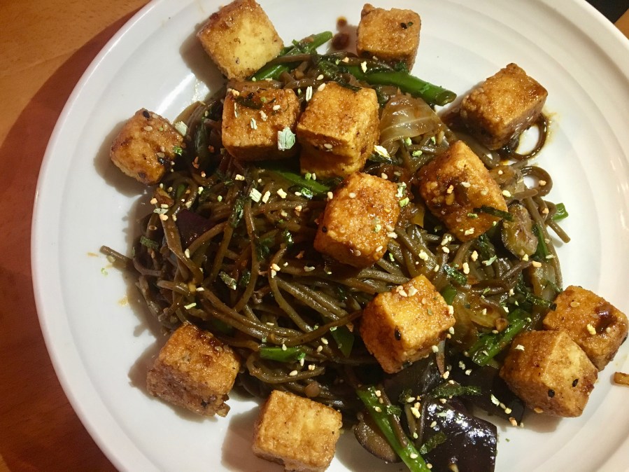 Three of us eat fairly healthy tonight. One of us does not, but he really enjoys his meal. Vegetarians might like the tofu with buckwheat soba noodles.