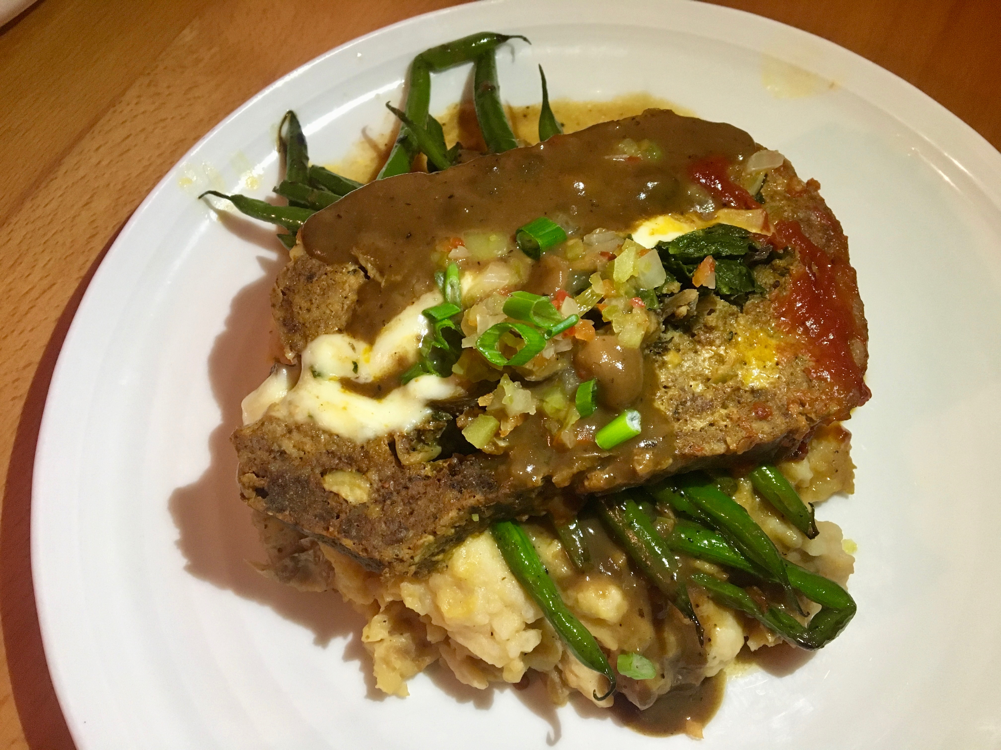 This is not your everyday, ordinary loaf. No, it’s stuffed with chorizo as well as spinach and mushrooms. It comes served over a pile of mashed potatoes and green beans (haricot verts if you are a French food fan). This is very filling and you will take some home. I should have, but I was hungry.