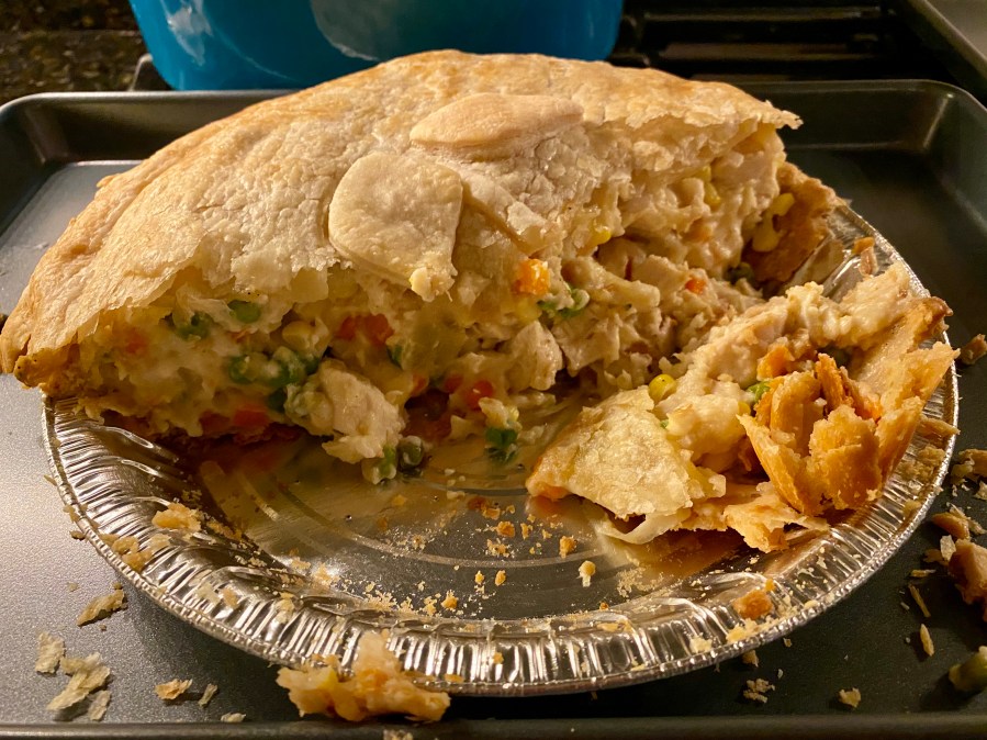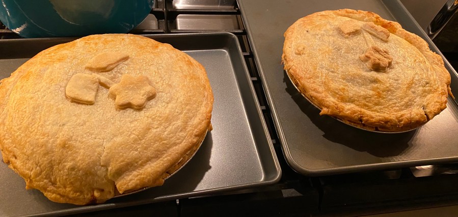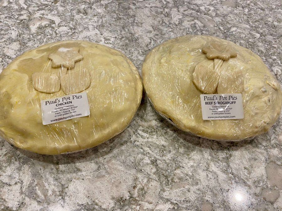 The chicken (on the left) is full of large chunks of meat, peas and carrots. The stroganoff has beef, mushrooms, broccoli and egg noodles. The chicken remains our favorite. We’ve never had a pot pie this good. It is the pie that made Paul’s famous.