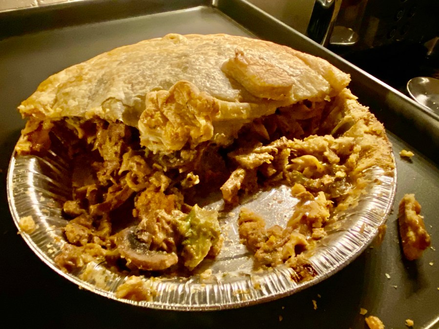 Good correspondents that we are, we have tried the vegetarian (excellent for veggie lovers) and turkey (Thanksgiving in a pie). Pop them in your oven and ninety minutes later, voila!