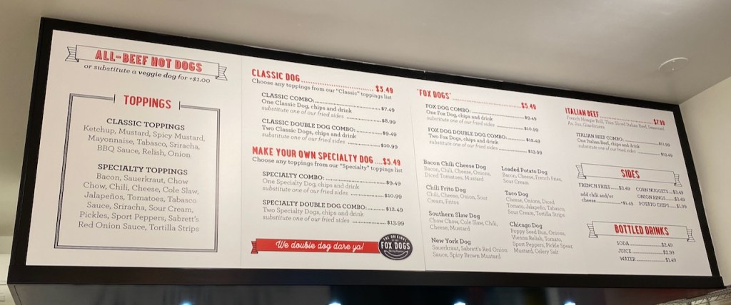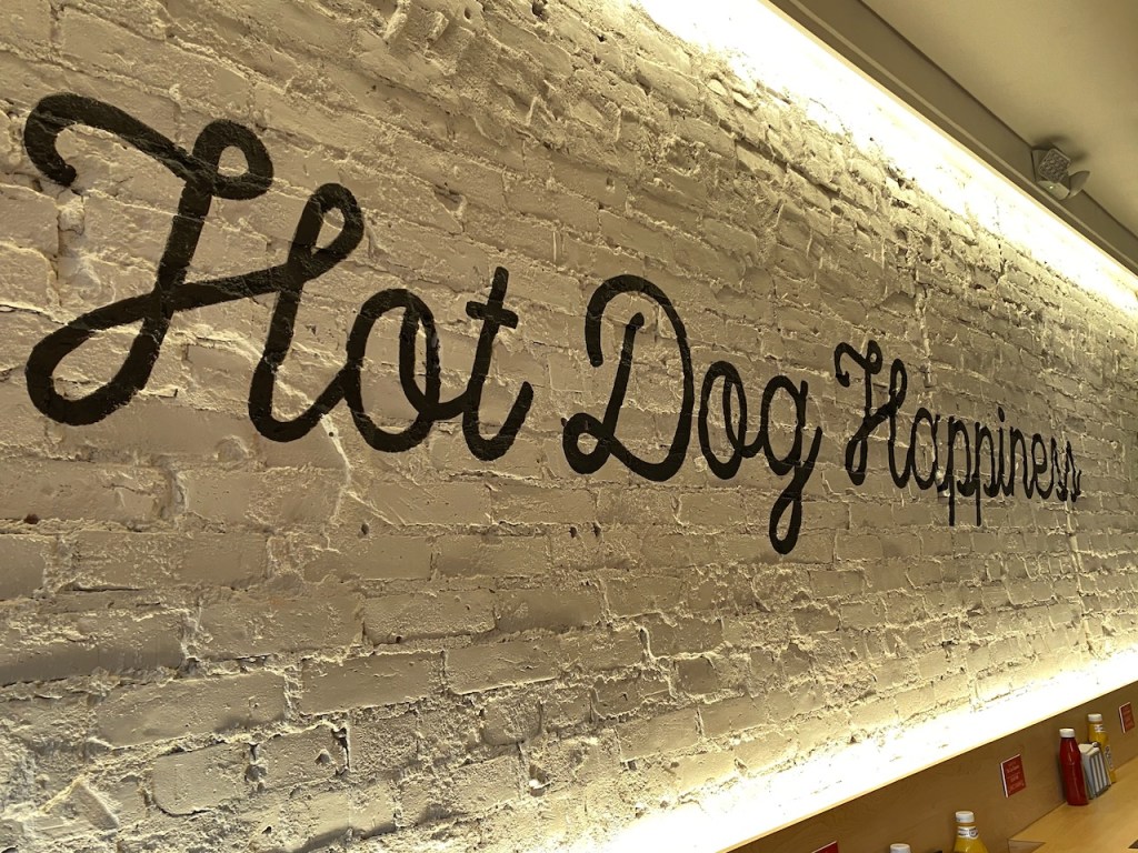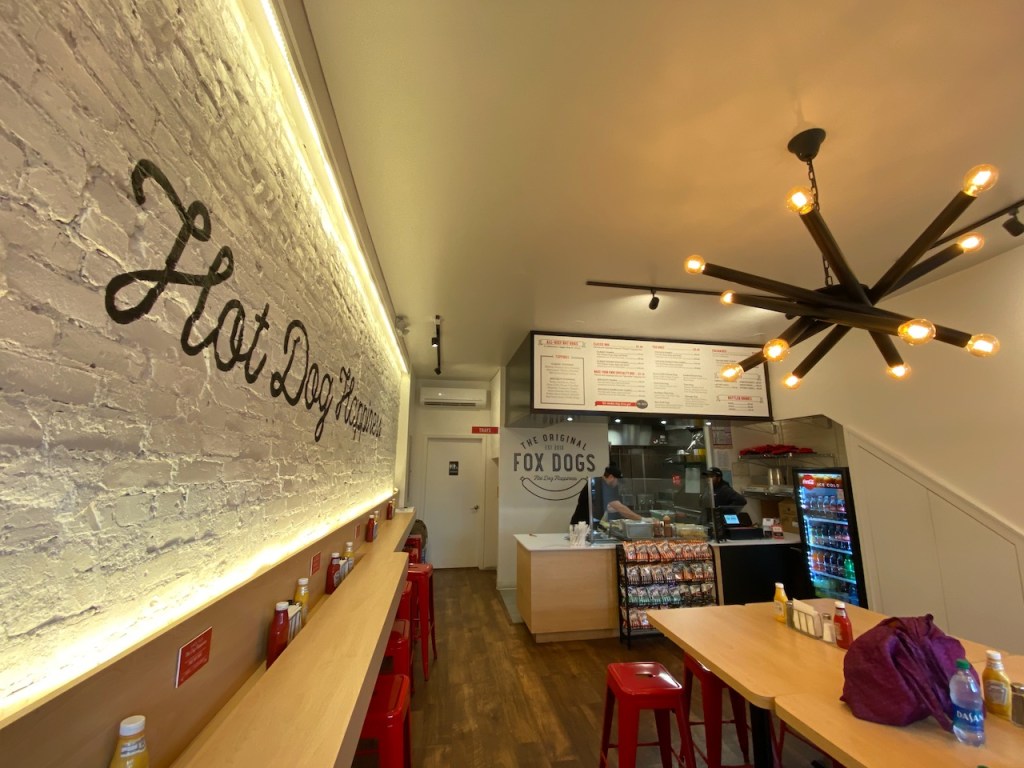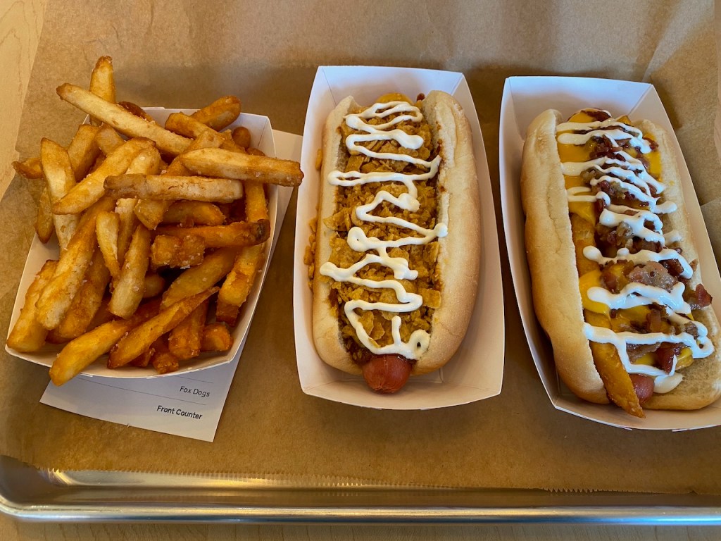 There are usually food trucks here, but let’s walk a block towards the square and pop into Fox Dogs.