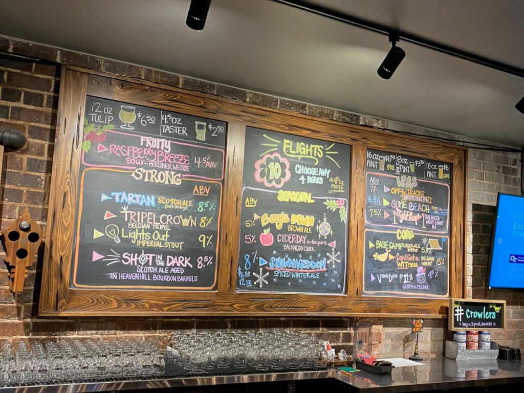 On a warm day, it is packed outside almost any night of the week. We head inside, where it’s nice and toasty. There’s a big chalkboard with their beers, which change with the seasons.