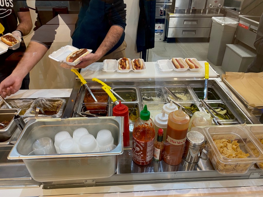 Hot dog lovers will be pleased with these all-beef beauties. You can get a veggie dog if you don’t eat meat. That’s owner Zach Fox behind the counter, dishing up the dogs. Sorry we cut off his head.