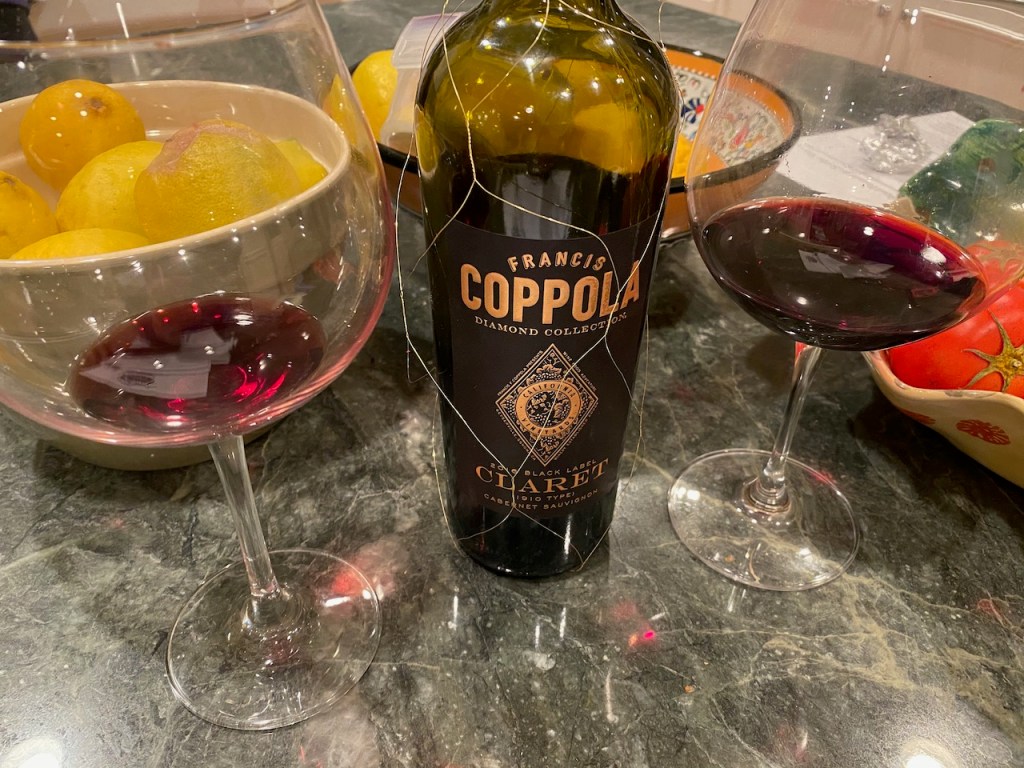One of the good things about getting takeout is that you can BYOB since you are sitting in your house. We pop open a bottle of Coppola Claret from the Diamond Collection. It’s a big-bodied Cabernet Sauvignon that’s made like a Claret from early last century. Let’s party like it’s 1910! After we open it and have a taste, we panic–have we just opened a $100 bottle of wine? Fortunately, you can get one for about $15.