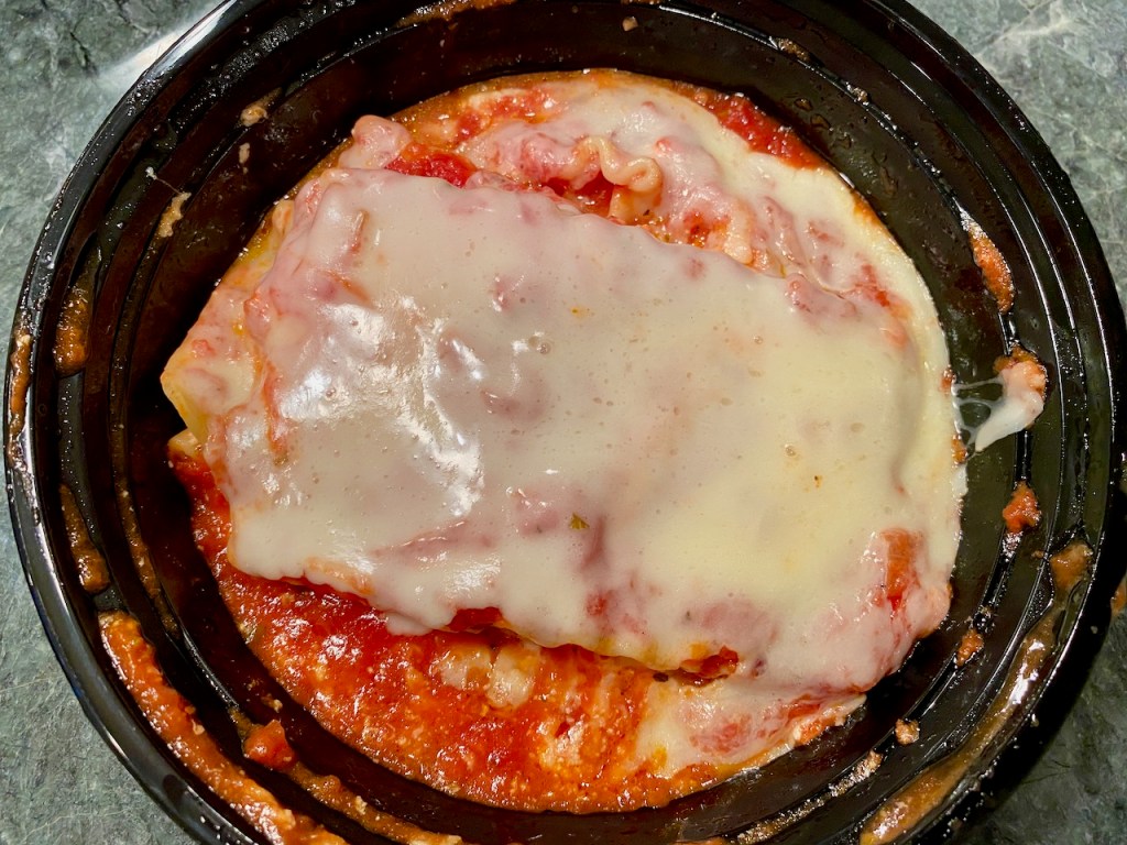 It’s lasagne, so under the cheese and tomato sauce is pasta, big chunks of sausage, and ground beef. We both share, thus enhancing our Italian experience.