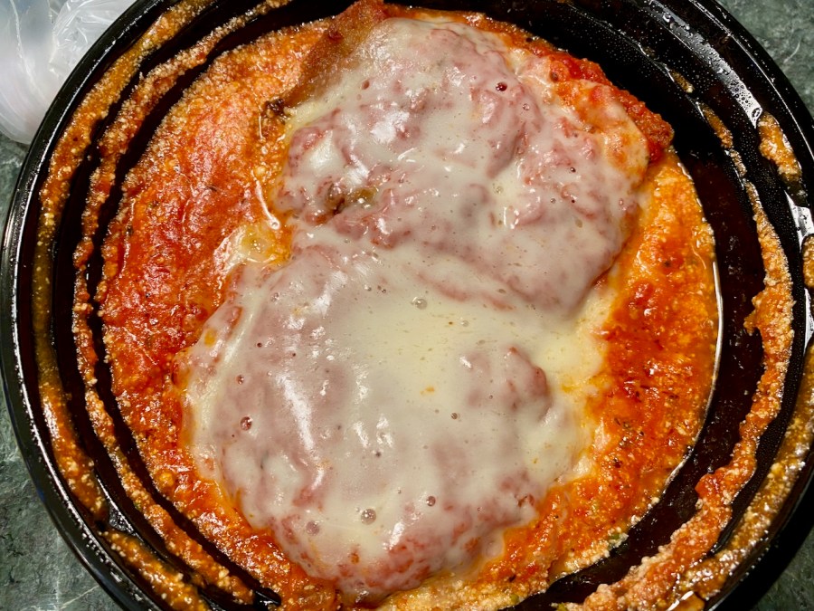 Eggplant parmesan is a staple when we order Italian. Mama D’s is excellent. It’s full of gooey cheese and big pieces of breaded eggplant. Our next dish looks similar, but it’s a lot different.