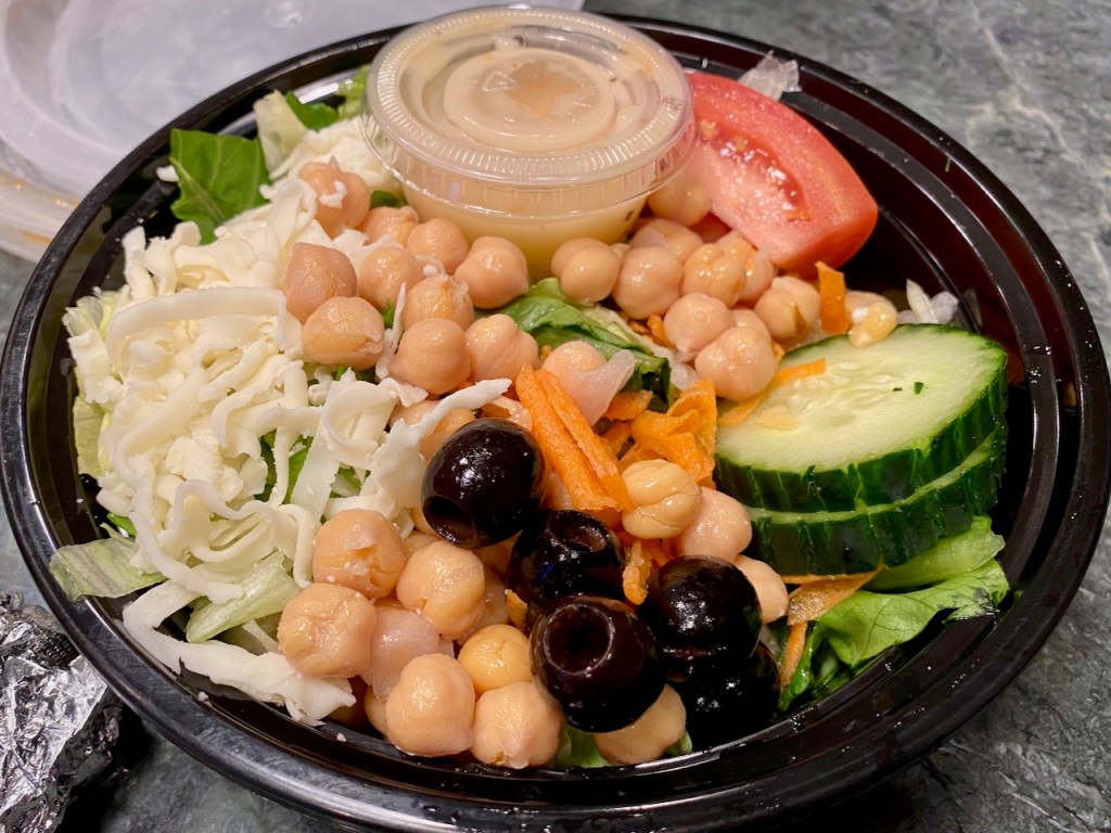 The garden salad really hits the spot tonight. We are not “salad starved” in California, and have been eating a lot of it. However, what we eat usually does not have olives, garbanzos, and mozzarella cheese, so that must be the reason. Maybe it’s the wine.