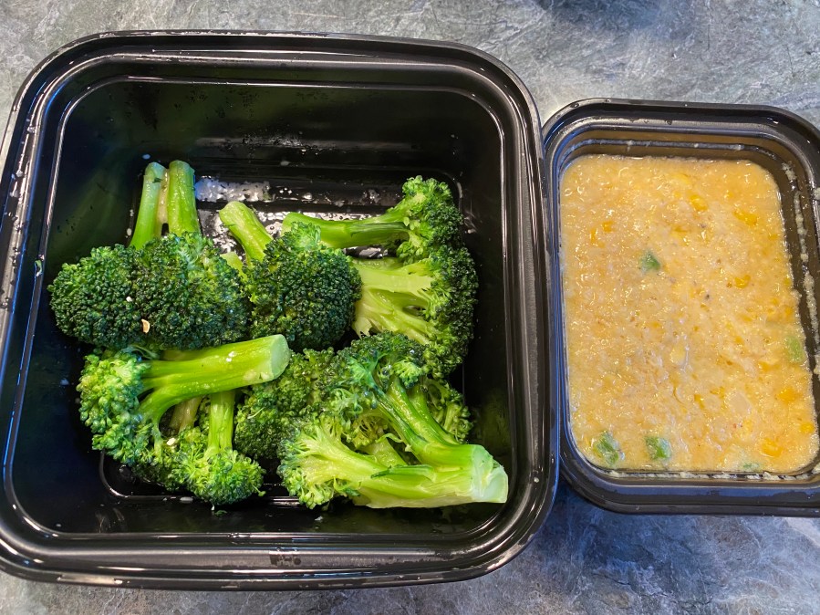 We get a couple of sides, the broccoli and creamed corn.