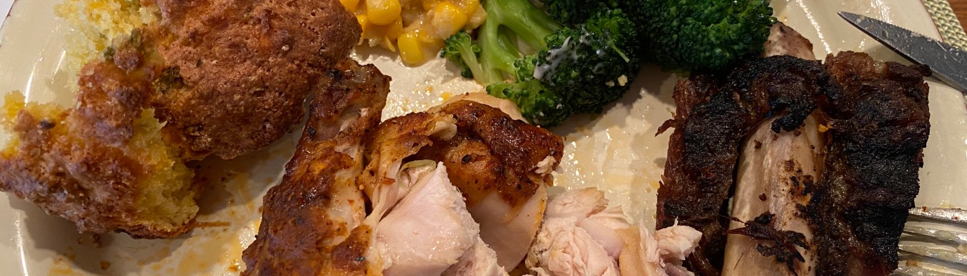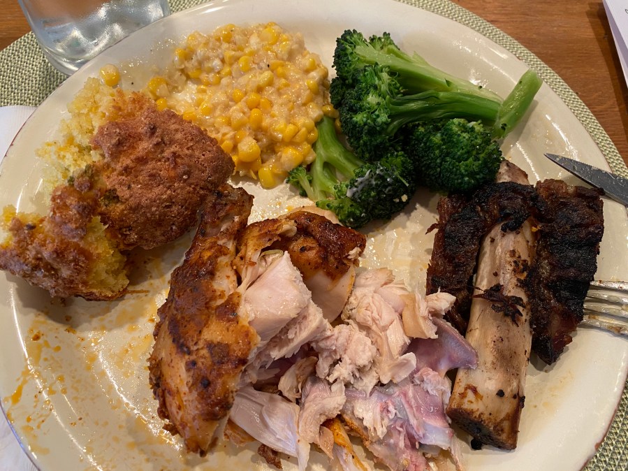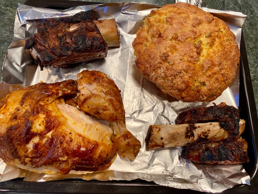 After smelling the chicken, you must order the chicken. It’s a nice, thick chunk of chicken breast and a leg. The ribs are very tender and eat like pot roast. One of the beef short ribs is a bit skimpy. You might have spied an order of cornbread in the upper right of the reheat tray.