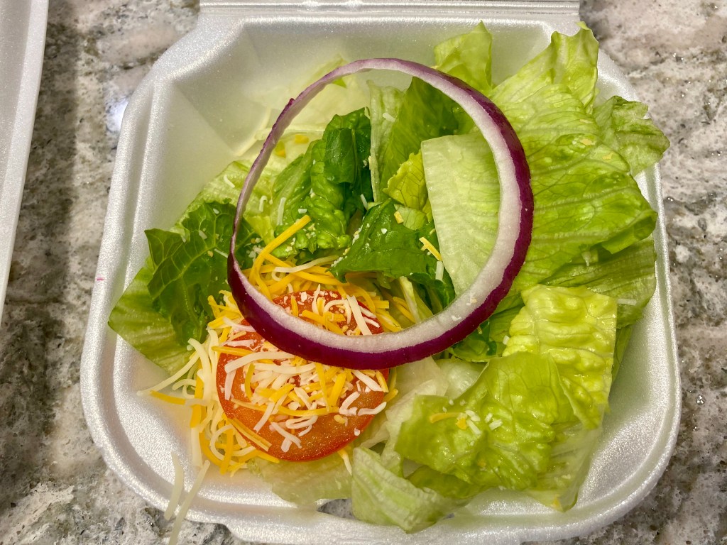 The fried okra and slaw are just OK. Nothing to gush about. We also get a side salad, which again is nothing special.