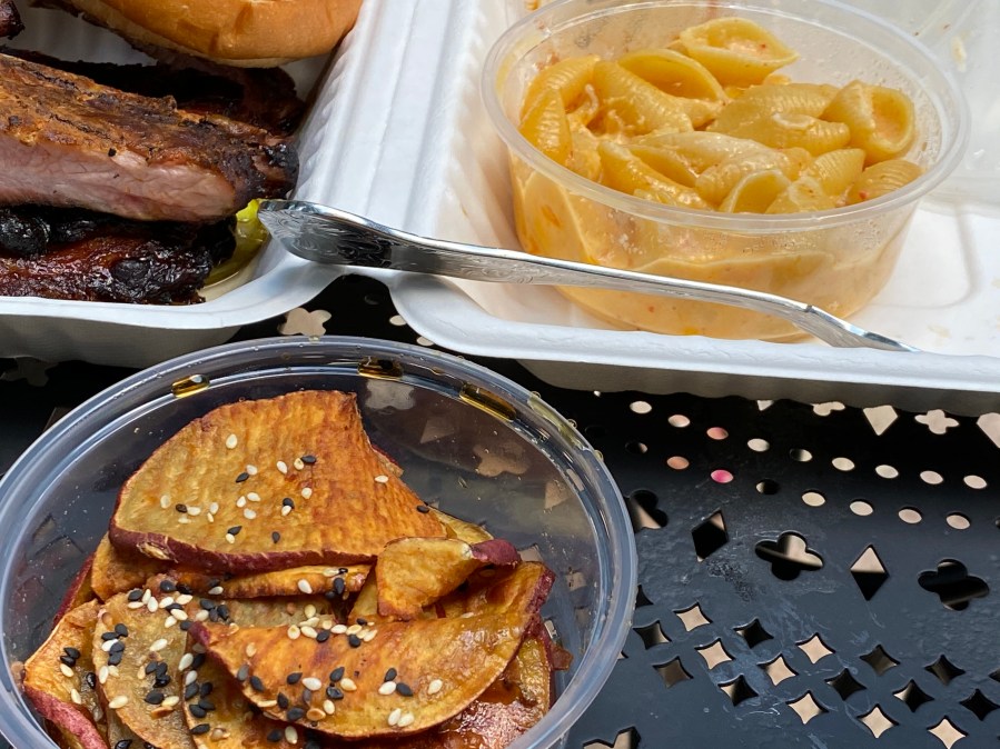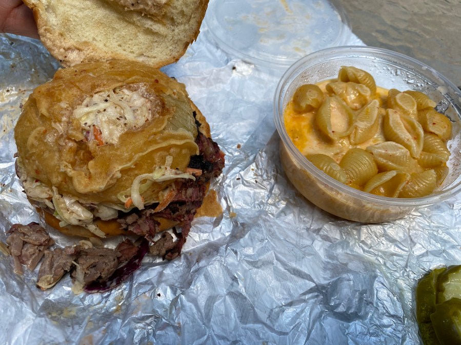 The brisket sandwich comes with an onion ring and slaw on top. It’s piled so high that she could not eat both sides of the bun because she could not open up her mouth wide enough. The onion ring got a little soggy in transit. Has anyone figured out how to transport fried food without the steam from it making everything soggy?
