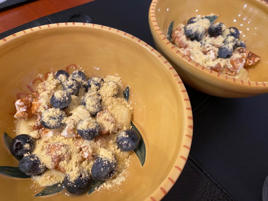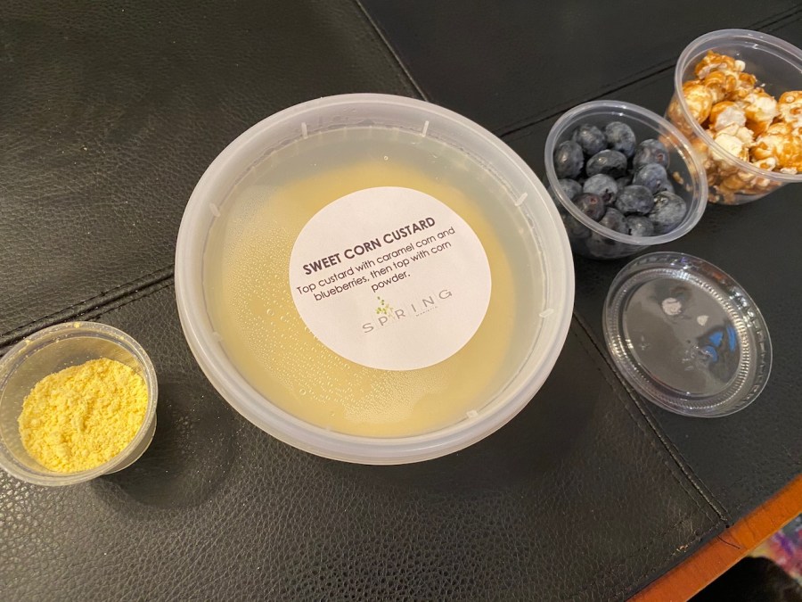 The sweet corn custard comes with blueberries, caramel corn and corn powder. Put them all together, and it looks like this: