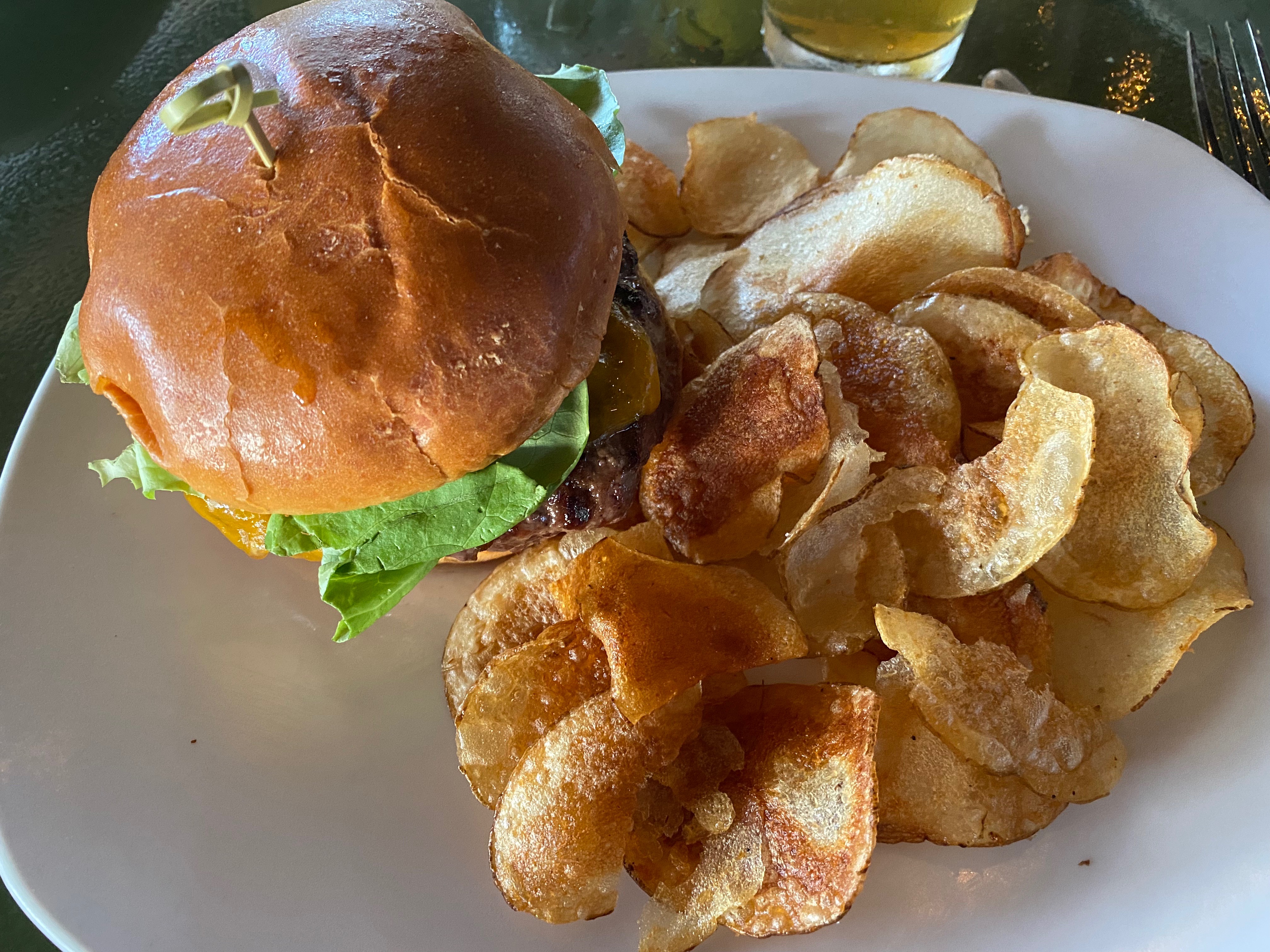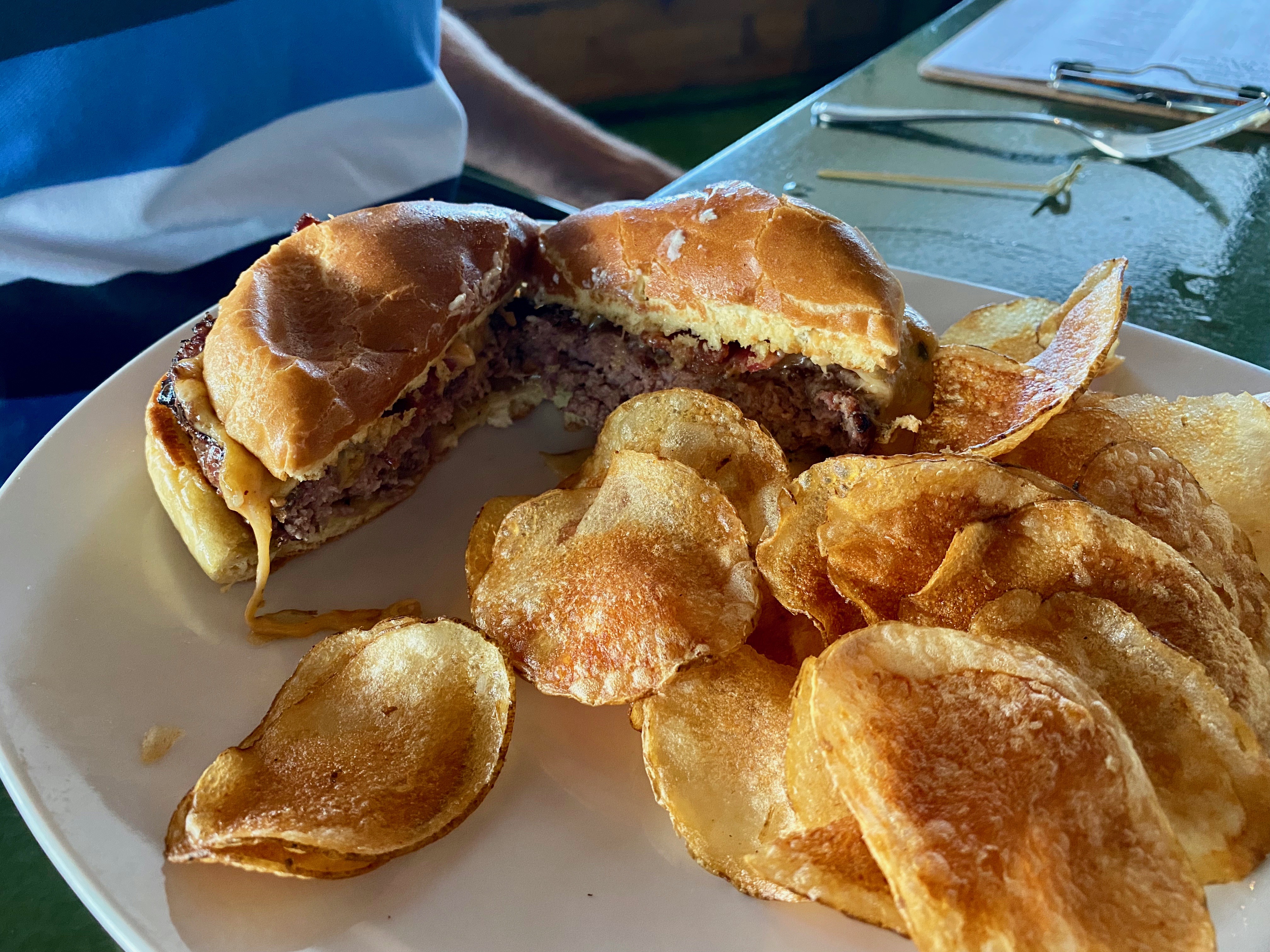 There is hardly any cheese on the burger. The house-made chips are the best thing on this plate. Should have gone with the ahi. Eve has the same problem with her classic burger.