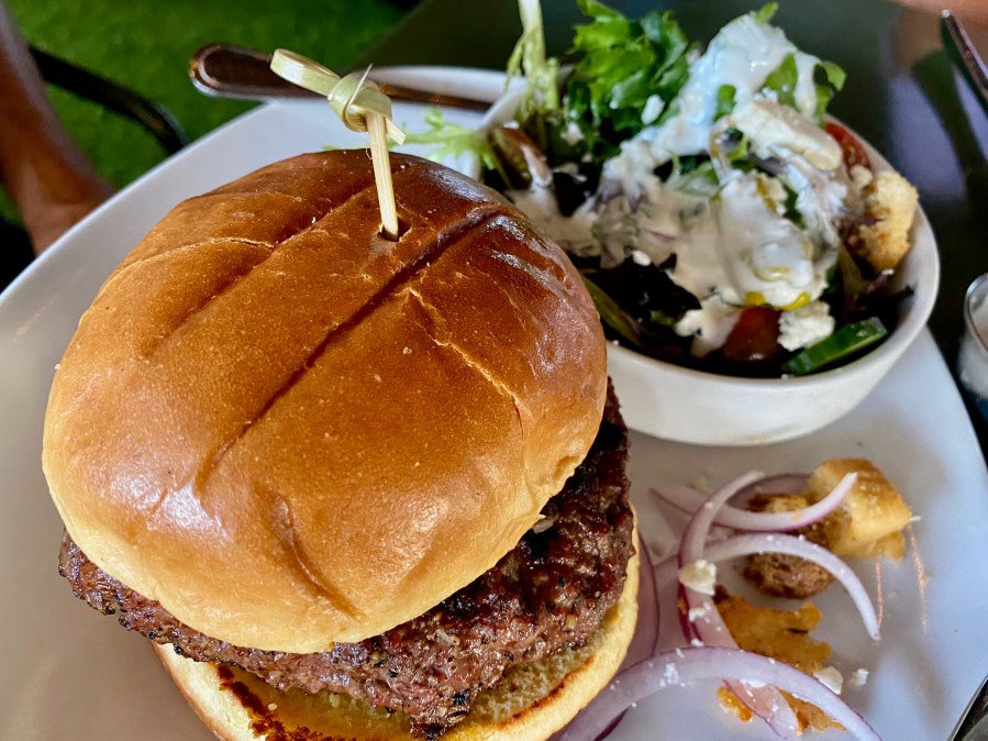 You get to pick a side with your burger. I am torn between the ahi tuna sandwich and a big, juicy burger. I pick the Monfort Square burger, which is bacon and pimiento cheese. Ordered medium rare, it’s not even close. It is medium-well and very dry.