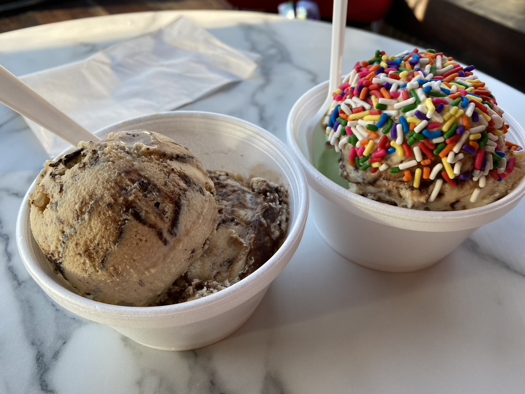 Yes, we should have shared one, but we got to try more this way. Happy, Happy, Joy, Joy (on the left) is their version of an Almond Joy with coconut, chocolate, and almonds. On the right, have a taste of Grilled Stickies, which is cinnamon ice cream with bits of cinnamon bun mixed in. Sinful.