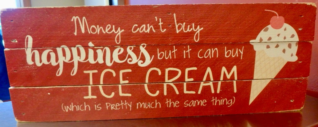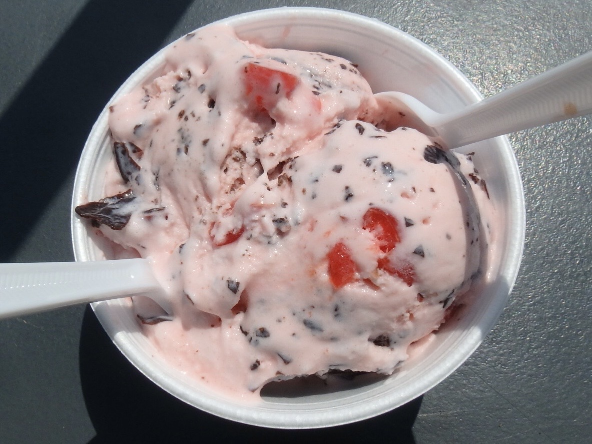 We split this scoop of Amaretto cherry chocolate chip. Because of bad storms, the power was off in much of Millersburg, OH, but fortunately for us, Millers Creamery had electricity, or this would have been two bowls of ice cream soup.